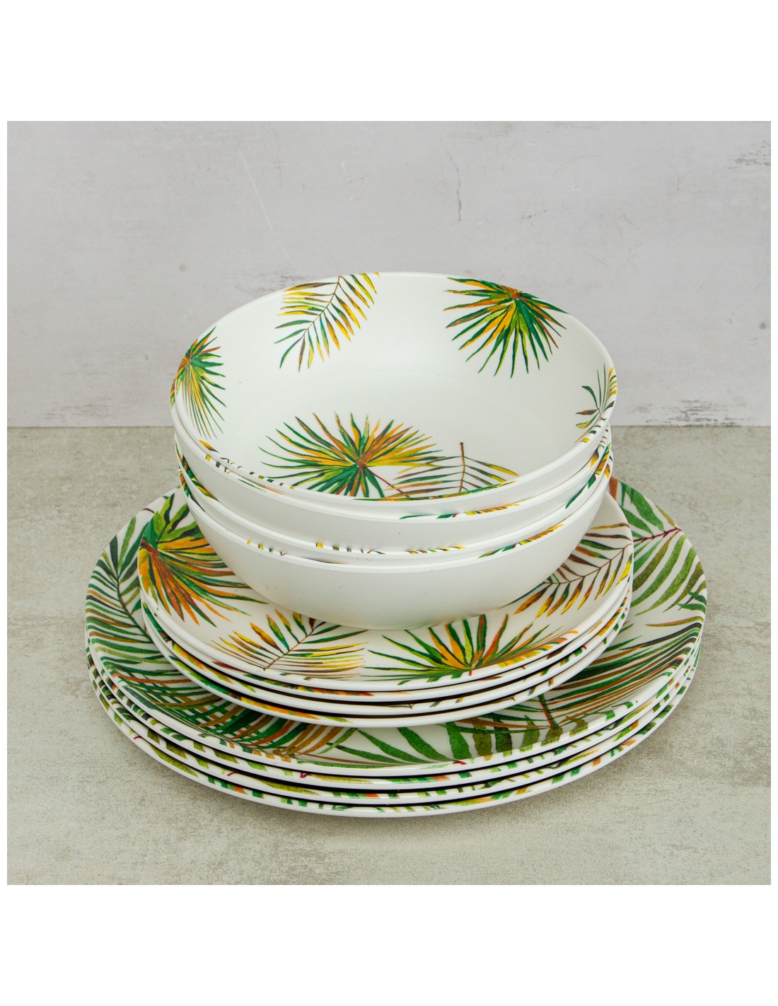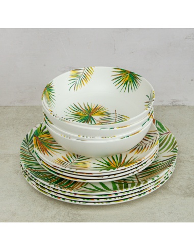 Lleva la frescura de la naturaleza a tu mesa con el Juego de 12 piezas Palm Leaf en melamina. Con un diseño tropical inspirado en hojas de palma, este set es perfecto para dar color y estilo a tus comidas, tanto en el día a día como en reuniones especiales.